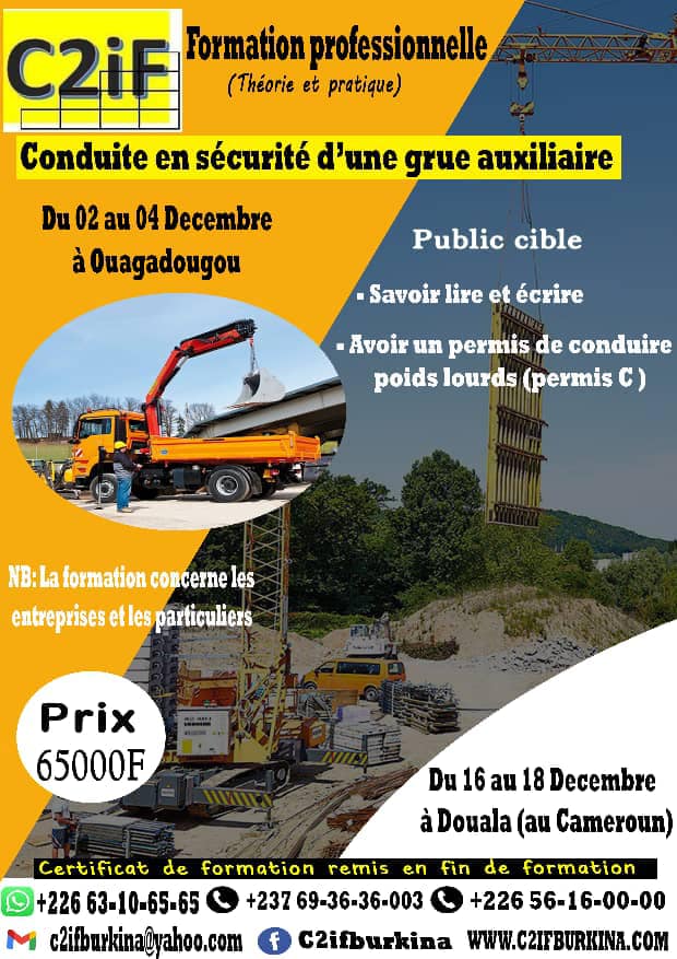 Grande Formation ! « Conduite en sécurité d’une grue auxiliaire »prévue pour le 02 au 04 décembre 2021 au Burkina (Ouagadougou) Et du 16 au 18 décembre au Cameroun (Douala) Les inscriptions ont déjà commencé Conditions : - Savoir lire et écrire -Avoir un permis de conduire poids lourds (permis C) Pour tout renseignement Contactez: https://wa.me/+22663106565 https://wa.me/+237693636003